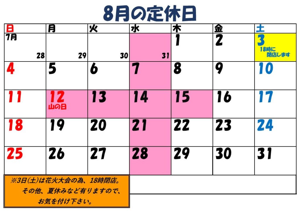 遅くなってしまいましたが、8月の定休日です。